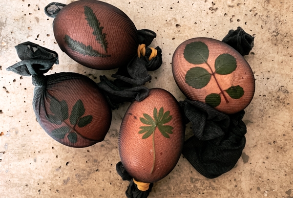 Stap 7: Knip voorzichtig de panty los en haal de bloemetjes/blaadjes van de eieren. Poets ze eventueel op met een beetje olie; shinend en op je paasbest aan het paasontbijt!