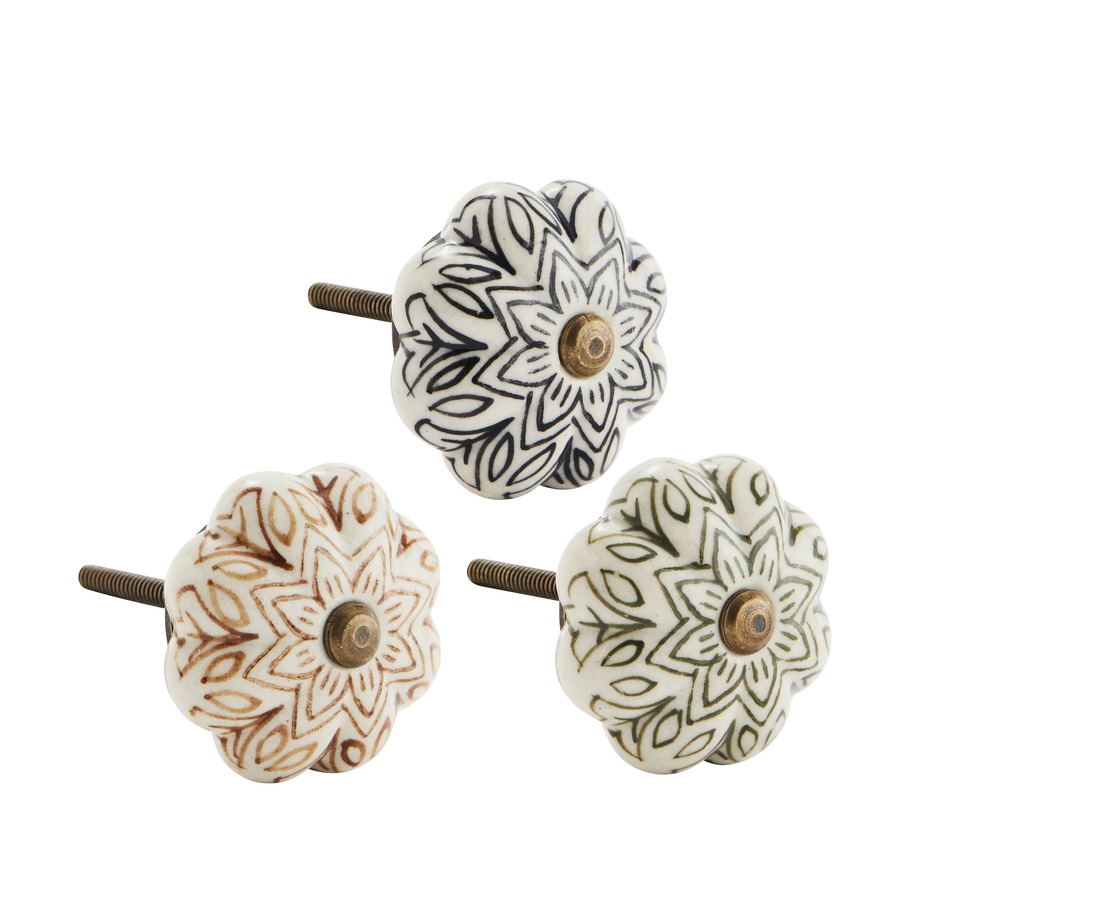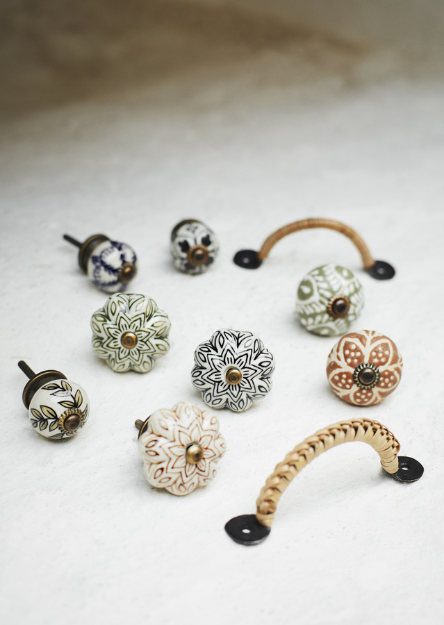Deze deurknop van Madam Stoltz is een sfeervol detail dat direct karakter geeft aan een kast, lade of meubelstuk. Het aardewerken gedeelte van circa 4,5 cm is met de hand beschilderd, waardoor elke deurknop een uniek en ambachtelijk uiterlijk heeft, en is verkrijgbaar met bruine, groene of zwarte beschildering.