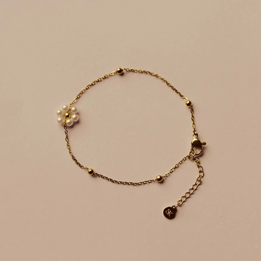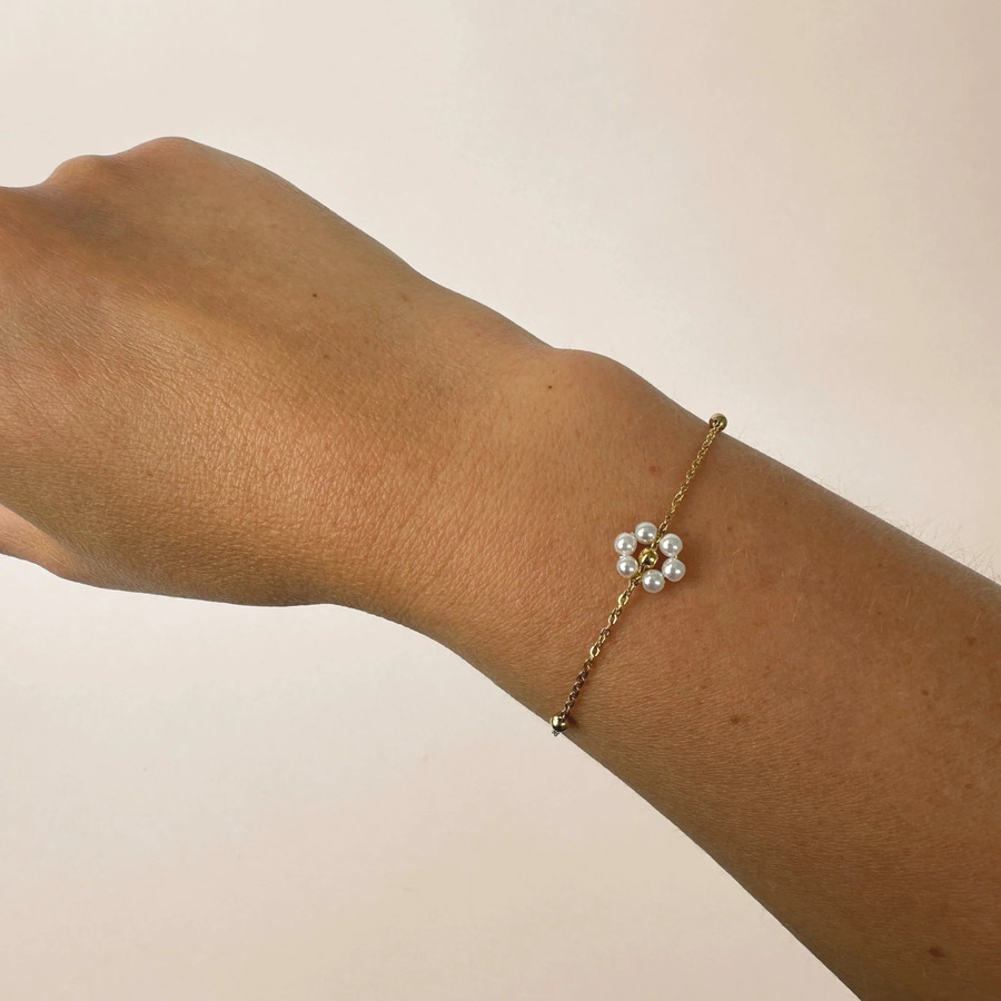 Aan de kaart is een elegant goudkleurig armbandje van stainless steel bevestigd, wat het echt een origineel cadeau maakt. Dit schattige armbandje met een madeliefje van parels voegt een persoonlijk en waardevol element toe.