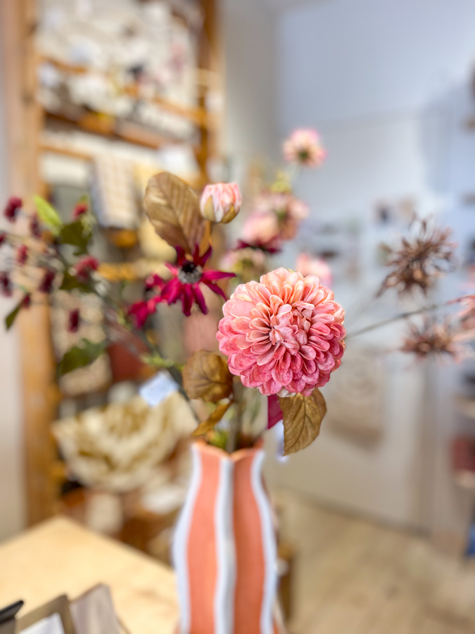 Haal de warme gloed van de herfst in huis met deze roze kunstdahlia. De volle, ronde bloem straalt zachtheid uit en de bruinige bladeren geven meteen dat knusse najaarsgevoel. Prachtig om solo in een vaas te zetten, maar ook ideaal om te combineren met andere herfsttinten tot een sfeervol boeket.