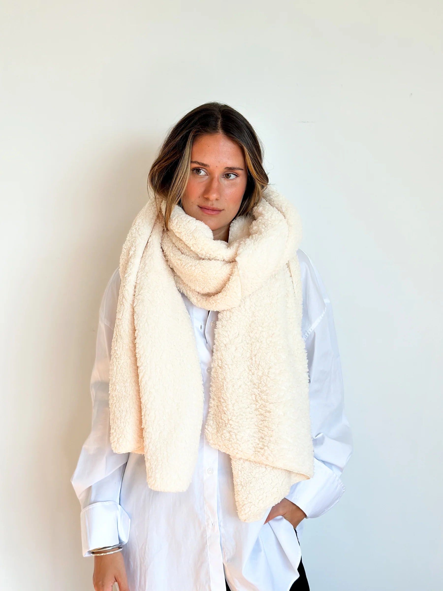 Deze beige sjaal van De La Mur Line is een heerlijke basic voor de winter. De zachte teddystof voelt comfortabel en warm aan, perfect voor frisse dagen. Dankzij het ruime formaat (240 cm lang!) kun je hem op allerlei manieren dragen. Losjes over je jas of lekker dik om je hals. De neutrale beige tint laat zich makkelijk combineren met elke outfit.