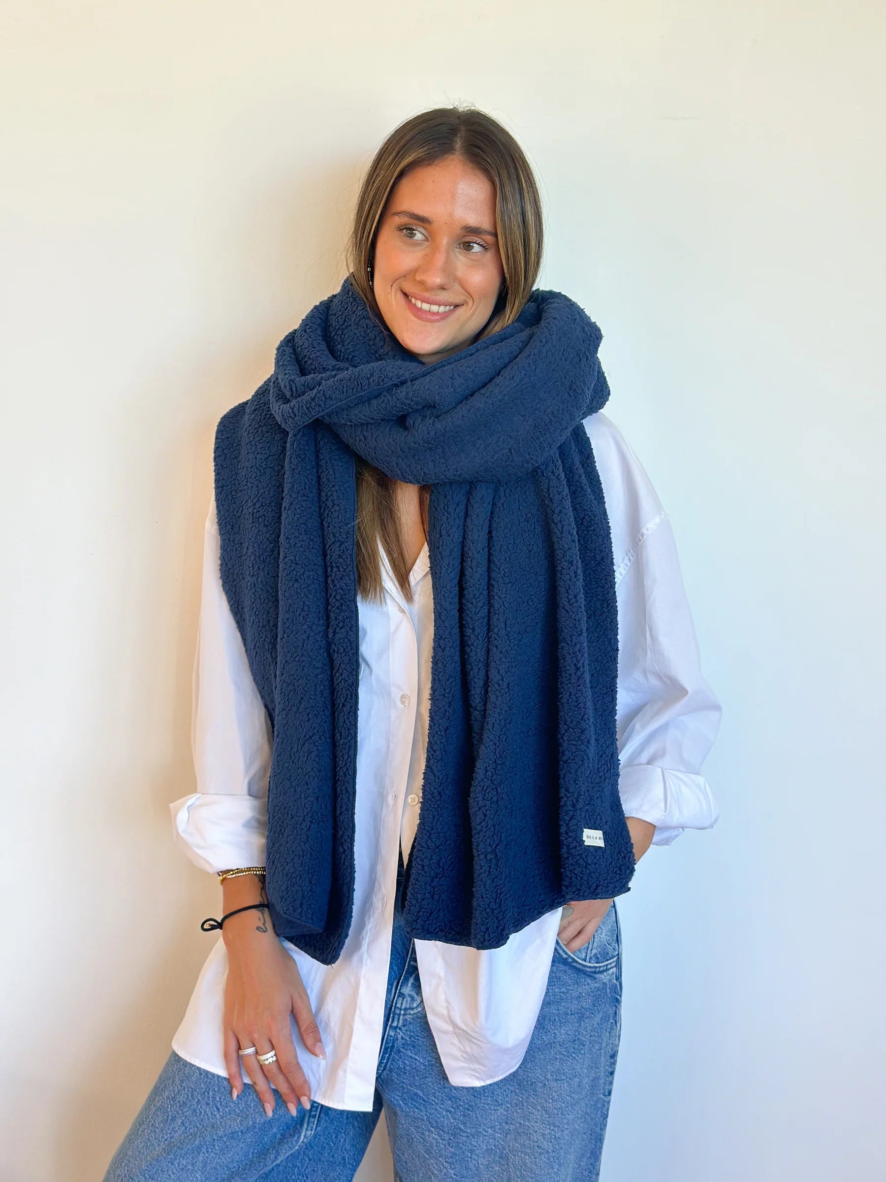 Deze donkerblauwe sjaal van De La Mur Line is een stijlvolle essential voor de winter. De zachte teddystof voelt heerlijk warm aan en nodigt uit om lekker in weg te kruipen. Dankzij het royale formaat (240 cm lang!) kun je hem dragen zoals jij wilt. Losjes, gewikkeld of omgeslagen. De diepe blauwe tint geeft elke outfit een rustige en verfijnde uitstraling.