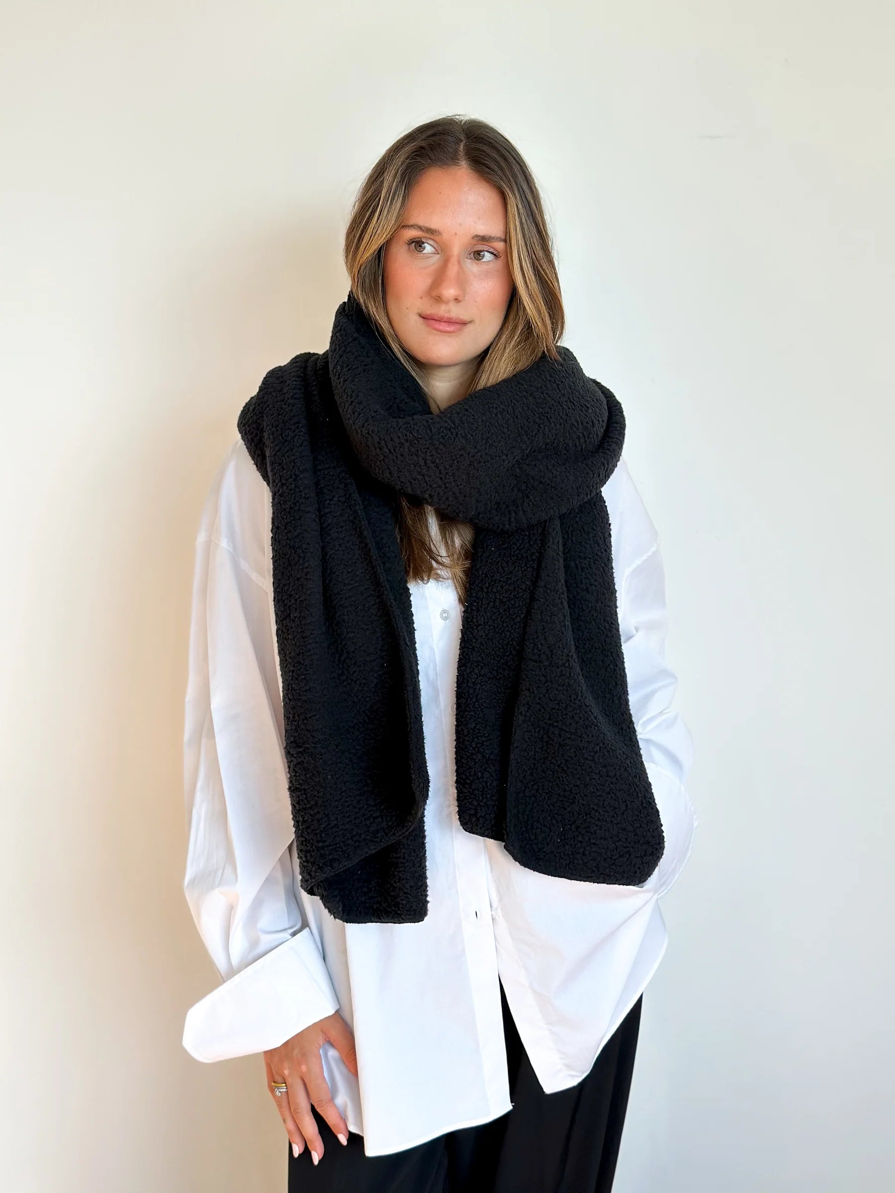 Deze zwarte sjaal van De La Mur Line is een echte allrounder. De zachte teddystof voelt heerlijk warm aan en is perfect voor koude dagen. Dankzij het royale formaat (240 cm lang!) draag je hem op allerlei manieren. Strak om je hals of nonchalant over je jas. De diepe zwarte kleur maakt elke look krachtig en tijdloos.